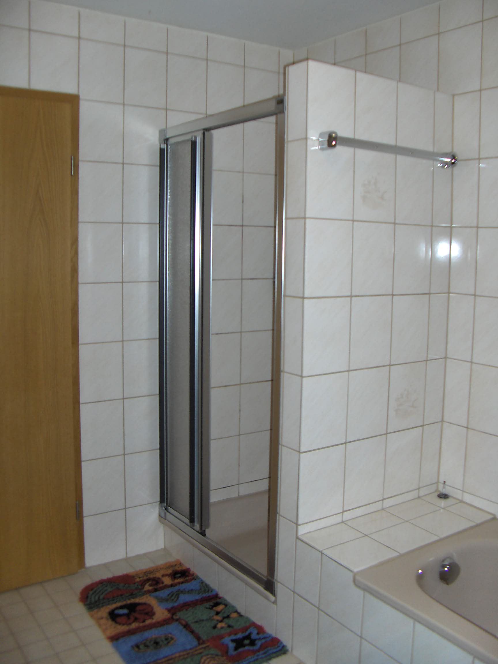 Das Badezimmer mit Badewanne, Dusche, Waschbecken und Toilette bietet genügend Platz, auch für mehrere Personen.